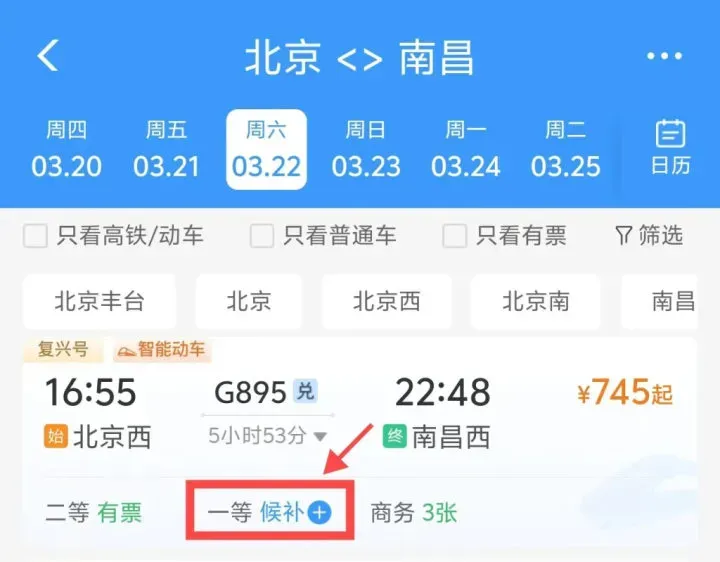 在火车票起售当日页面,点击购票信息预填,旅客即可提前选择乘车人、预选车次、预选席别,火车票起售时便可快速提交订单。第一时间未买到车票的旅客可以通过12306网站、手机客户端中的“候补购票”服务功能进行候补购票。