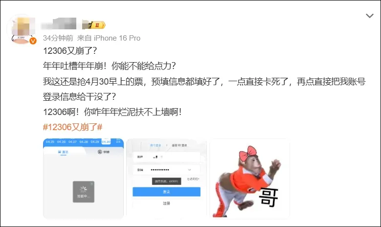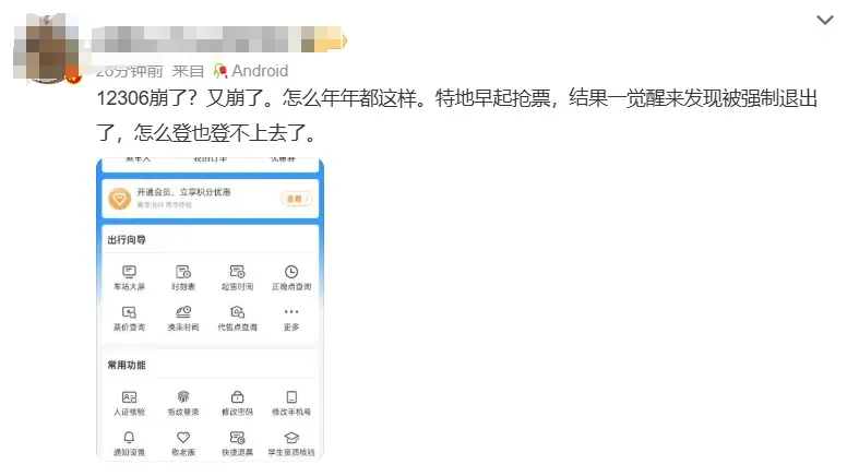 据报道,有多名网友发文称中国铁路12306 系统出现崩溃现象,不少用户反映无法正常登录、购票卡顿、订单显示异常等问题。